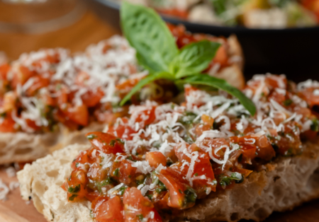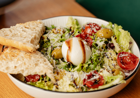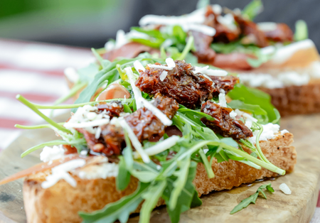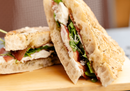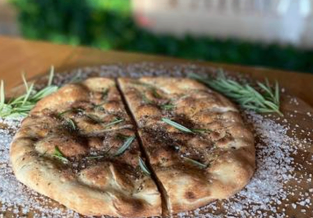 Pieczywo z rozmarynem, a w środku włoska wołowa breasola z szarpaną bufalą, słodkimi podsuszanymi pomidorkami koktajlowymi i rukolą. Podane w formie kanpaki z oliwą pietruszkowo-czosnkową | 250g