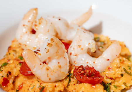 Gotowany na winie ryż arborio z krewetkami i peperoncino oraz lekko słonawym sambalem. Posypane pietruszką i pomidorkami koktajlowymi | 400g