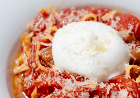 Smażone włoskie guanciale z czosnkiem, cebulą, chili, sosem z pomidorów pelati podane z kremową burratą i grana padano D.O.P. | 350g