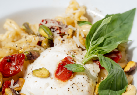 Makaron strozzapreti czyli spiralne rurki podane ze szpinakiem w emulsji bazyliowej. Słodkie podsuszane pomidorki koktajlowe oraz kremowa burrata (50g)z dodatkiem pistacji | 400g
