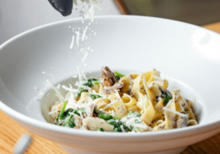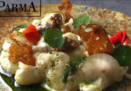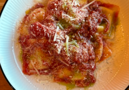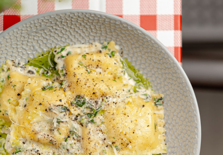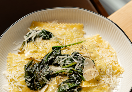 4 szt. ravioloni nadziewane serem ricotta z mleka bawolego i liśćmi szpinaku, podane na emulsji maslano-winnej ze świeżym szpinakem i mascarpone | 250g