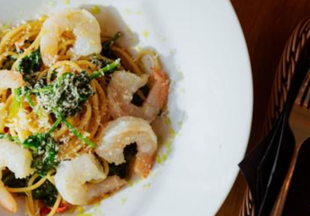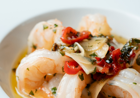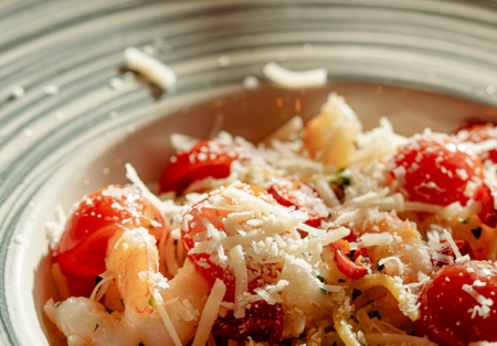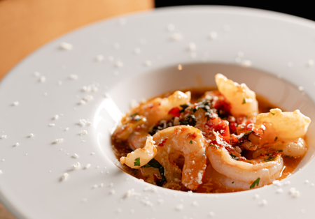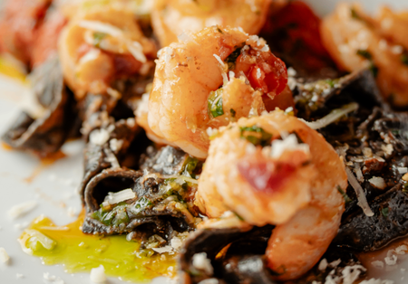 Czarne tagliatelle z krewetkami, chili i czosnkiem w sosie maślano-winnym z dodatkiem pomidorów pelati i świeżej pietruszki