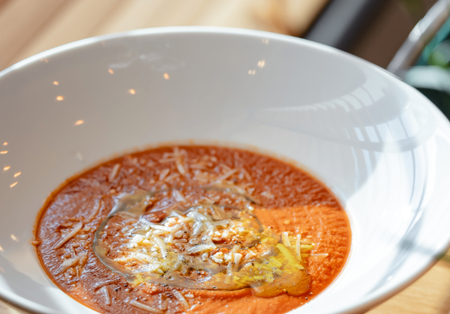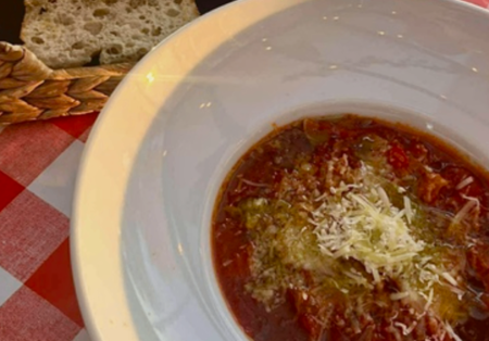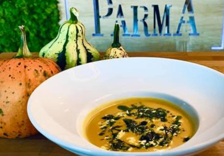 Aromatyczna zupa z pomidorów pelati, papryki i warzyw z nutą wina, włoskich ziół i odrobiną pikantnego chili. Podawana z pieczywem, Grana Padano D.O.P. i oliwą pietruszkową | 250ml