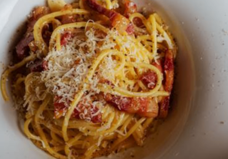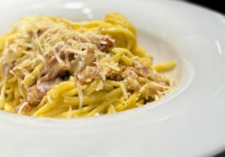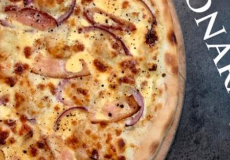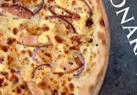sos śmietanowy/mozzarella/boczek/cebula/jajko/czosnek/pieprz/grana padano D.O.P.