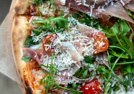 pomidory pelati/mozzarella/rukola/włoska szynka dojrzewająca prosciutto crudo/pomidory cherry/grana padano D.O.P.