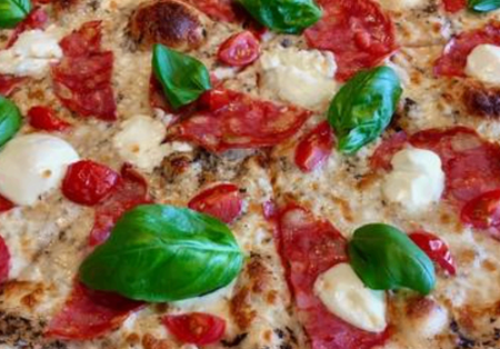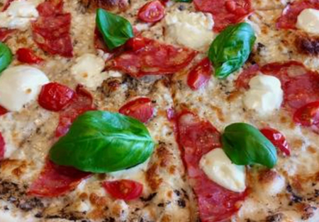 sos śmietanowo-truflowy/mozzarella/mascarpone/salami ventricina/pomidory cherry/świeża bazylia