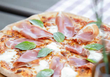 pomidory pelati/mozzarella/di bufala D.O.P./włoska szynka dojrzewająca prosciutto crudo/świeża bazylia