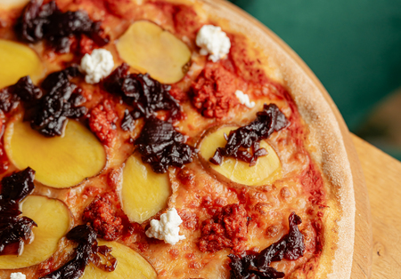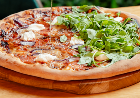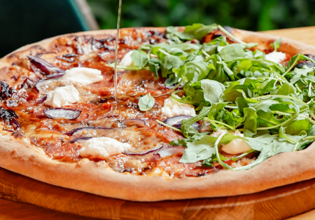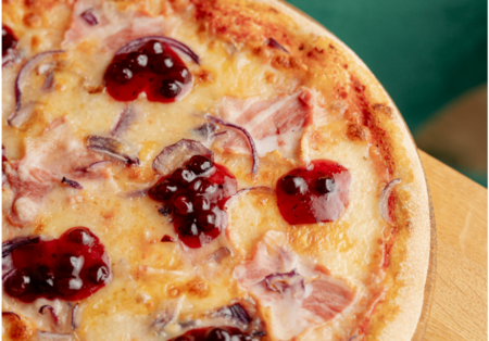 powidła śliwkowe/mozzarella/salami ventricina/cebula/ricotta/rukola
