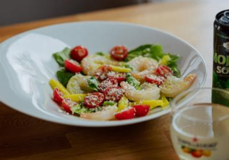 sos śmietanowo-bazyliowy, krewetki 6 szt., szpinak, chili, czosnek, cebula | 300g