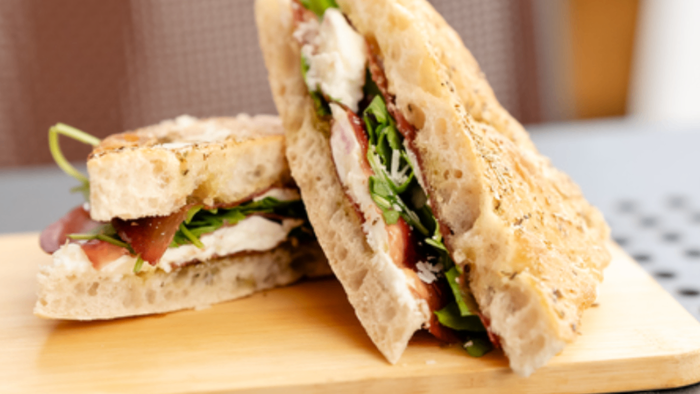 Pieczywo z rozmarynem, a w środku włoska wołowa breasola z szarpaną bufalą, słodkimi podsuszanymi pomidorkami koktajlowymi i rukolą. Podane w formie kanpaki z oliwą pietruszkowo-czosnkową | 250g