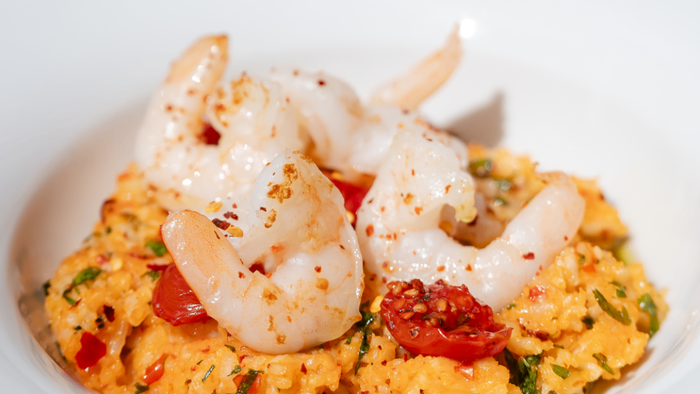Gotowany na winie ryż arborio z krewetkami i peperoncino oraz lekko słonawym sambalem. Posypane pietruszką i pomidorkami koktajlowymi | 400g