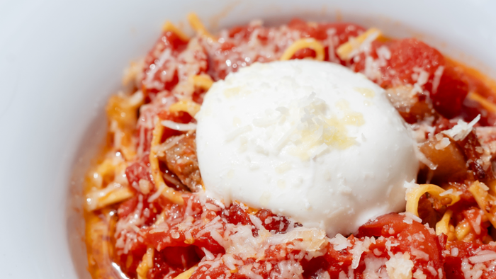 Smażone włoskie guanciale z czosnkiem, cebulą, chili, sosem z pomidorów pelati podane z kremową burratą i grana padano D.O.P. | 350g