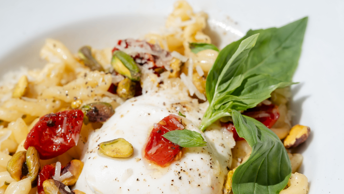 Makaron strozzapreti czyli spiralne rurki podane ze szpinakiem w emulsji bazyliowej. Słodkie podsuszane pomidorki koktajlowe oraz kremowa burrata (50g)z dodatkiem pistacji | 400g