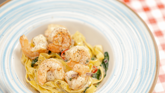 sos śmietanowo-bazyliowy, krewetki 6 szt., szpinak, chili, czosnek, cebula | 300g