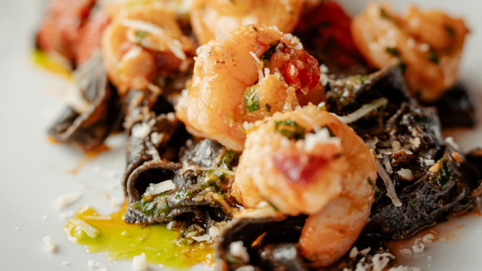 Czarne tagliatelle z krewetkami, chili i czosnkiem w sosie maślano-winnym z dodatkiem pomidorów pelati i świeżej pietruszki