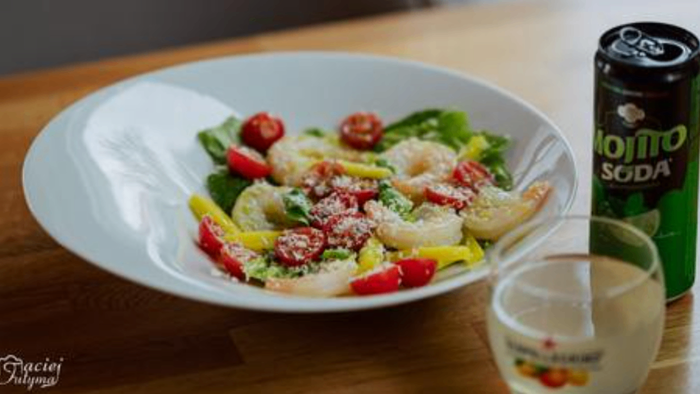 krewetki 6 szt./mix sałat/pomidorki cherry/grana padano D.O.P./marynowana rzodkiew/oliwa pietruszkowo-czosnkowa/pieczywo | 350g