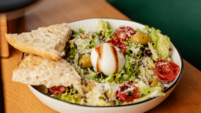 burrata - 50g, mix sałat, pomidorki podsuszane, oliwki verdi piccanti, oliwa pietruszkowo-czosnkowa, grana padano D.O.P., pieczywo | 350g