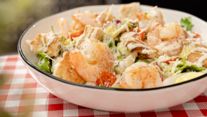 krewetki 6szt/mix sałat/pomidory cherry/sos a’la cezar/grana padano D.O.P./oliwa pietruszkowo-czosnkowa/pieczywo | 350g